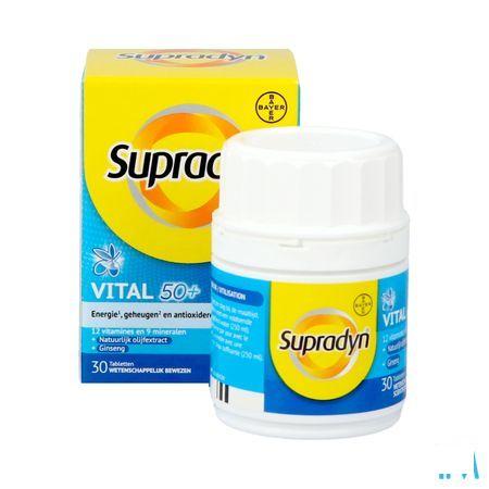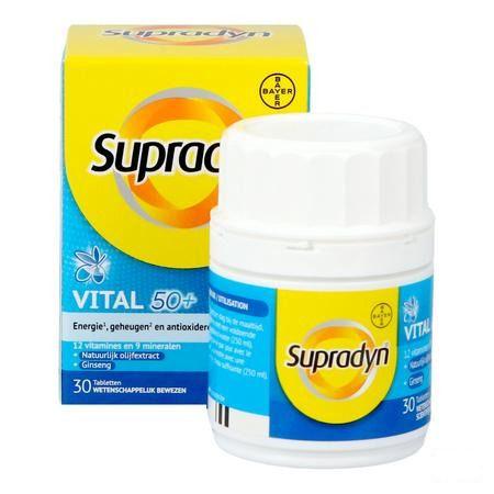 Supradyn Vital 50+ is een voedingssupplement speciaal ontwikkeld met die vitamines, mineralen en antioxidanten in aangepaste dosis om aan de specifieke behoeften van de vijftigplusser te voldoen. De formule bevat ook ginseng van hoge kwaliteit en natuurlijk olijfextract.
