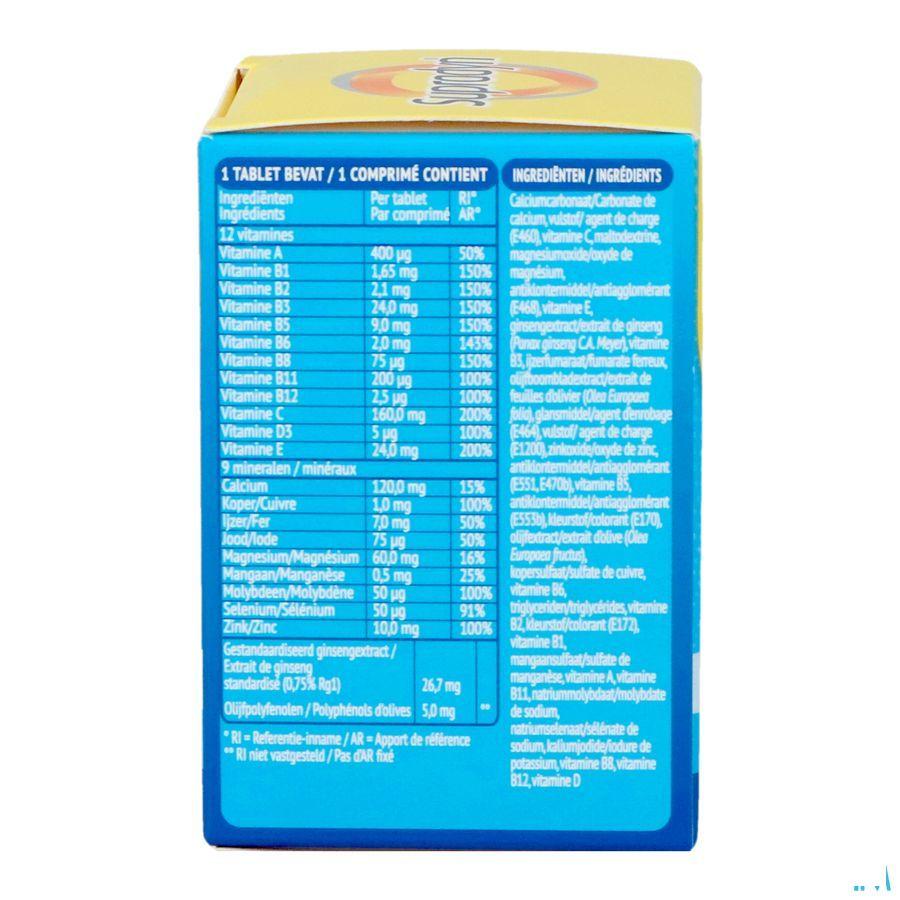 ingrediënten per tablet : VITAMINEN vitamine A : 400 ug vitamine B1 : 1.65 mg vitamine B2 : 2.1 mg vitmine B3 : 24 mg vitamine B5 : 9.0 mg vitamine B6 : 2 mg vitamine B8 : 75 ug vitamine B11 : 200 ug vitamine B12 : 2.5 ug vitamine C : 160 mg vitamine D3 : 5 ug vitamine E : 24 mg MINERALEN / SPORENELEMENTEN calcium : 120 mg koper : 1 mg ijzer : 7 mg jood : 75 ug magnesium : 60 mg mangaan : 2 mg molybdeen : 50 ug selenium : 50 ug zink : 10 mg PLANTENEXTRACTEN ginseng-extract : 26.7 mg equivalent ginsenoside Rg 10,200mg olijfboom-blad-extract : 21 .43 mg olijfextract : 5 mg Calciumfosfaat, zwaar magnesiumoxide, L-ascorbinezuur, draagstof (E460i), echte ginseng (Panax ginseng C.A. Meyer), DL-alfa-tocoferylacetaat, nicotinamide, zinkcitraat, ijzer(II)fumaraat, antiklontermiddel (E468), glansmiddelen (E470b, E464), D-biotine, calcium-D-pantothenaat, retinylpalmitaat, glansmiddel (E553b), antiklontermiddel (E551), kleurstof (E171), mangaansulfaat, pyridoxinehydrochloride, riboflavine, koper(II)sulfaat, thiaminemononitraat, cholecalciferol, cyanocobalamine, glansmiddel (E463), kaliumjodide, kleurstof (E141ii), pteroylmonoglutaminezuur, chroom(III)chloride, natriummolybdaat, natriumselenaat.