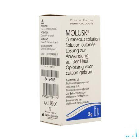 MOLUSK is een oplossing voor de lokale behandeling van Molluscum contagiosum (parelwratjes) bij volwassenen en kinderen vanaf 2 jaar. Het bestaat uit 10% kaliumhydroxide en gedestilleerd water. De 10% kaliumhydroxide werkt uitwendig op de huid en denatureert de eiwitstoffen in het weefsel. Het product moet eenmaal per dag door een volwassene op elk afzonderlijk te behandeling Molluskum letsel worden aangebracht. Breng met het penseel het product precies in het midden van elk letsel aan, zonder de gezonde huid te raken, laat het 1 tot 2 minuten drogen en spoel vervolgens elk letsel af met een in water gedrenkt wattenschijfje. Herhaal deze 3 stappen elke dag op elk te behandelen Molluscum totdat roodheid, irritatie of ontsteking optreedt. Op dit punt is het raadzaam de behandeling te stoppen, het Molluscum verdwijnt geleidelijk in 2 tot 5 weken na het stoppen van de behandeling. Lees aandachtig de bijsluiter voor gebruik.