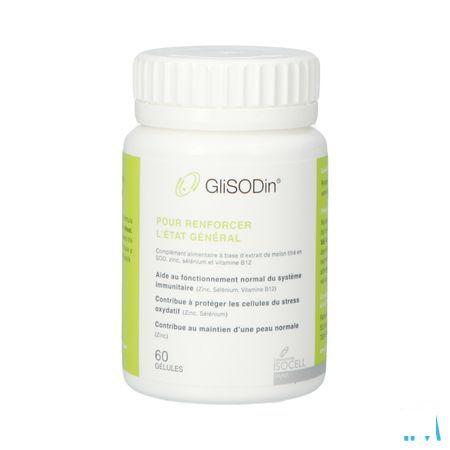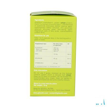 Composition nutritionnelle Par dose journalière (2 gélules) AR* GliSODin Extrait de fruit de melon dont SOD 500 mg 6,65 mg 500 UI Zinc 10 mg 100% Sélenium 50 μg 91% Vitamine B12 2,5 μg 100% *AR: apport de référence **UI: Unité internationale GliSODin® (maltodextrine, gliadine (protéine de blé), extrait de fruit de melon (Cucumis melo L.) titré en superoxyde dismutase (SOD)), agent d'enrobage: hydroxypropylméthylcellulose, gluconate de zinc, levure enrichie en sélénium, antiagglomérant : sels de magnésium d'acides gras, cyanocobalamine (vitamine B12). Formulation : Capsules végétales