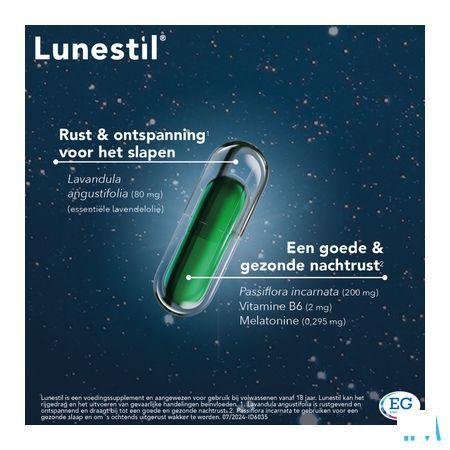 Huile de tournesol hydrogénée (Helianthus annuus); Extrait de passiflore sauvage (Passiflora incarnata extract 200 mg); Enrobage: Gélatine de Poisson, Agent d'enrobage: Hydroxypropylméthylcellulose, Gélifiant: Gomme gellane; Huile de lavande (Lavandula angustifólia Mill. 80 mg); Chlorhydrate de pyridoxine (vit B6 2 mg – 143 % AR*); Mélatonine (0,295 mg); Agent de charge: Cellulose microcristalline; Colorant: Complexe de cuivre de chlorophyllines. *AR : apport de référence. GARANTIE CLEAN LABEL : LUNESTIL ne contient pas de dioxyde de titane ni de dioxyde de silice. La gélule externe est constituée de gélatine de poisson, la gélule interne est végétale. Sans lactose et sans gluten. LUNESTIL est un complément alimentaire de la plus haute qualité, produitselon les normes de qualité les plus strictes.