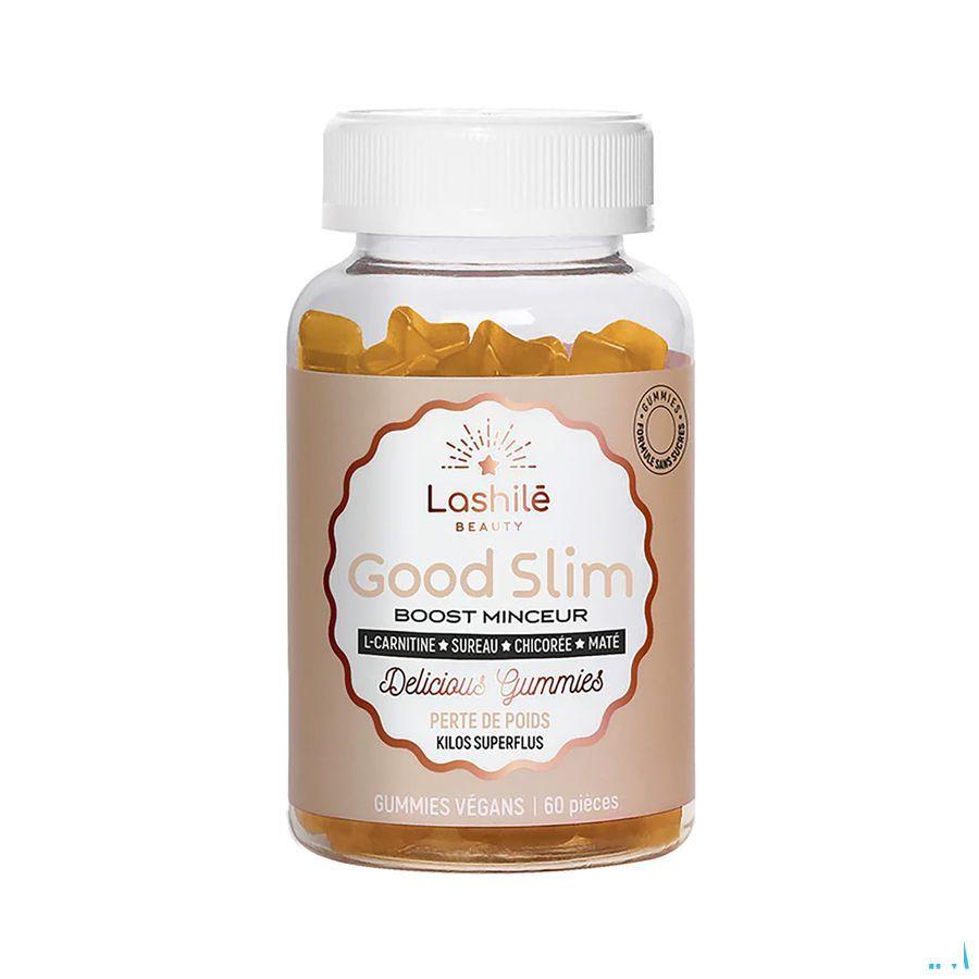 Ingrédients: Agent de charge: maltitol, Agent acidifiant: acide citrique, L-carnitine tartrate, Agent gélifiant: pectine, Extrait sec de feuille de maté (Ilex paraguariensis A.St.-Hil.), Extrait sec de fleur de sureau (Sambucus nigra L.), Acide ascorbique (vitamine C), poudre de racine de chicorée (Cichorium intybus L.), Arôme naturel, Concentré (carthame et citron), Agent acidifiant: citrate de sodium, Agent acidifiant: citrate de sodium, Agent d'enrobage: cire de carnauba, Chlorhydrate de pyridoxine (vitamine B6). Le Maté contient naturellement 5 mg de caféine dans Good Slim.